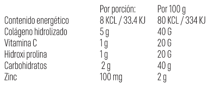 Ingredientes: Colágeno Hidrolizado, Vitamina C, Maltodextrina, Hidroxiprolina, Saborizante Natural y Artificial, Dióxido de Silicio, Sucralosa